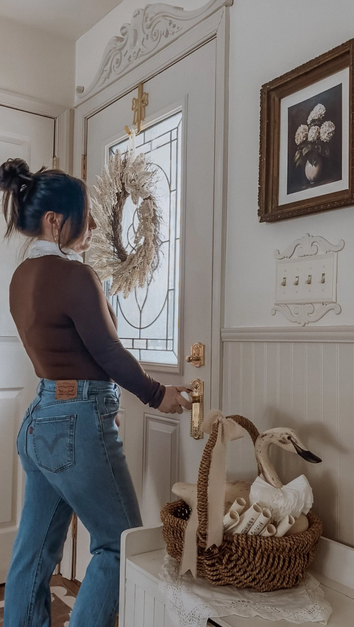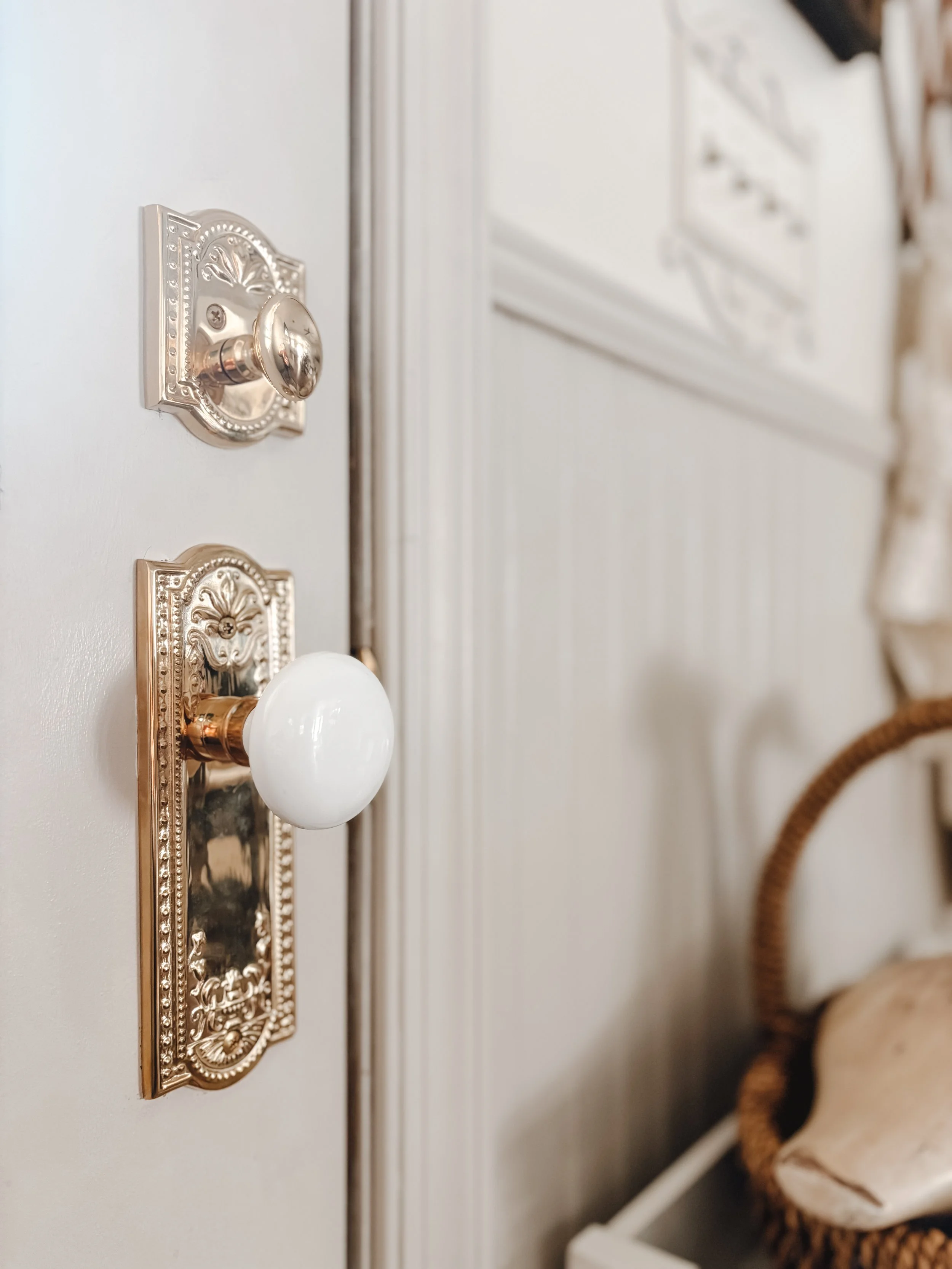 After installing the new entry set, we styled the entry to highlight the warmth of the brass and the timeless feel of the porcelain knob. Soft textures, natural materials, and vintage-inspired accents help create a welcoming first impression while letting the hardware remain a beautiful focal detail.