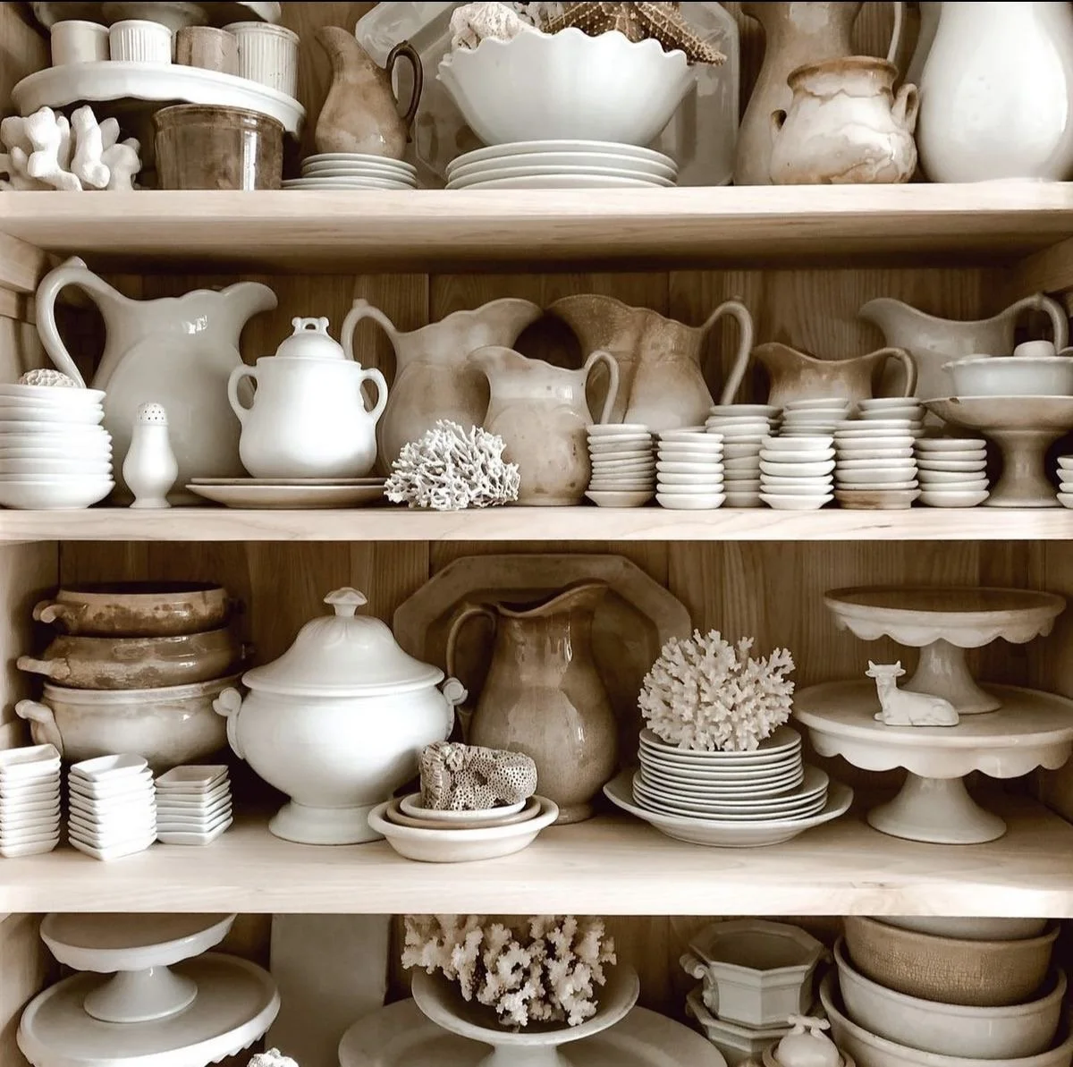 Stacked & Layered: Display stacks of ironstone plates and bowls in a hutch or open shelving for a classic, collected-over-time look.