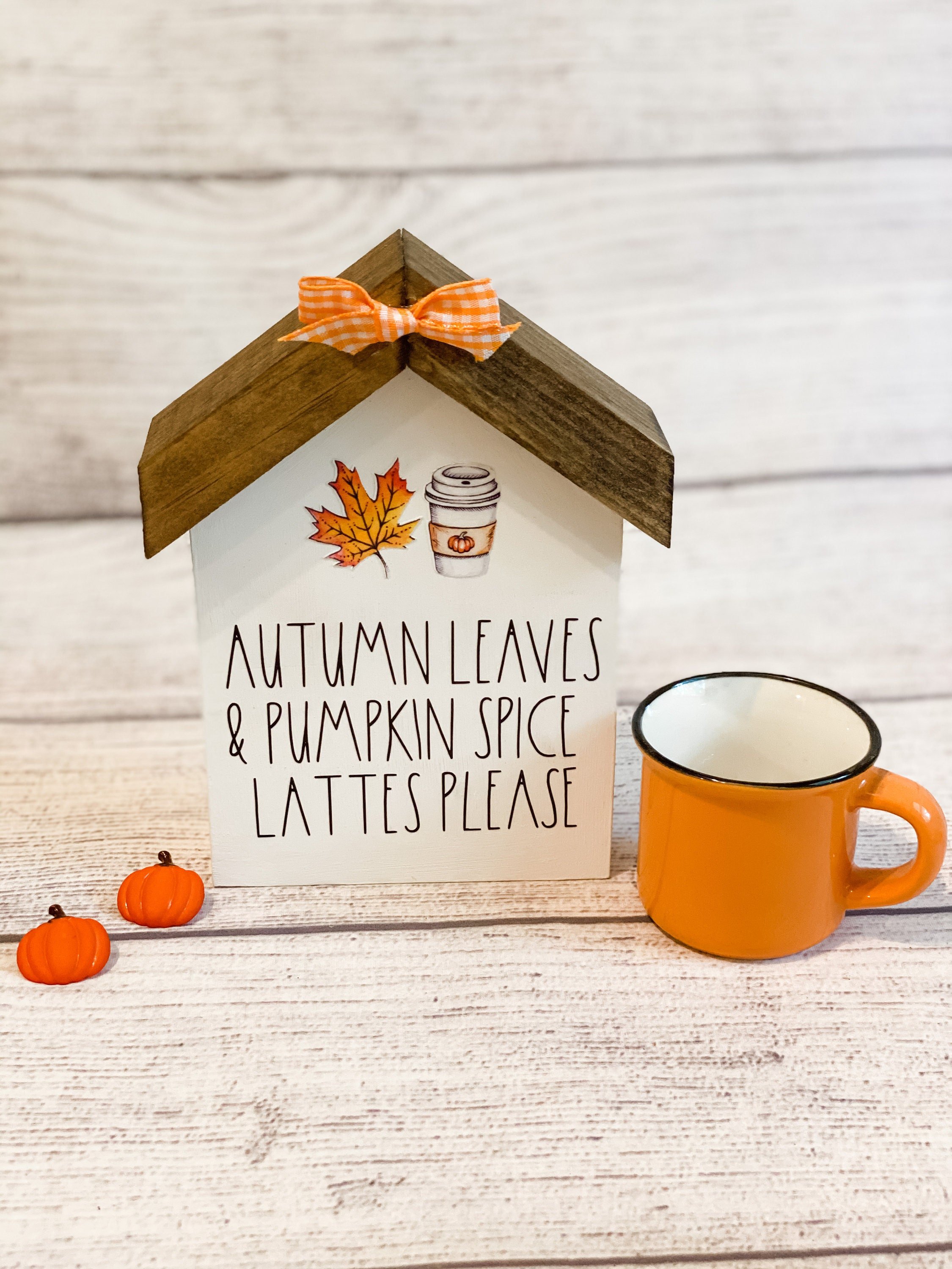 "Autumn Leaves and Pumpkin Spice Lattes Please" measures Height= 6.5" Width= 4" x Depth= 1.5" -Features a dark walnut stained wood roof and is painted with white chalk paint -The lettering is black premium permanent vinyl and a printed vinyl leaf and PSL at the top. An orange gingham plaid bow is at the top